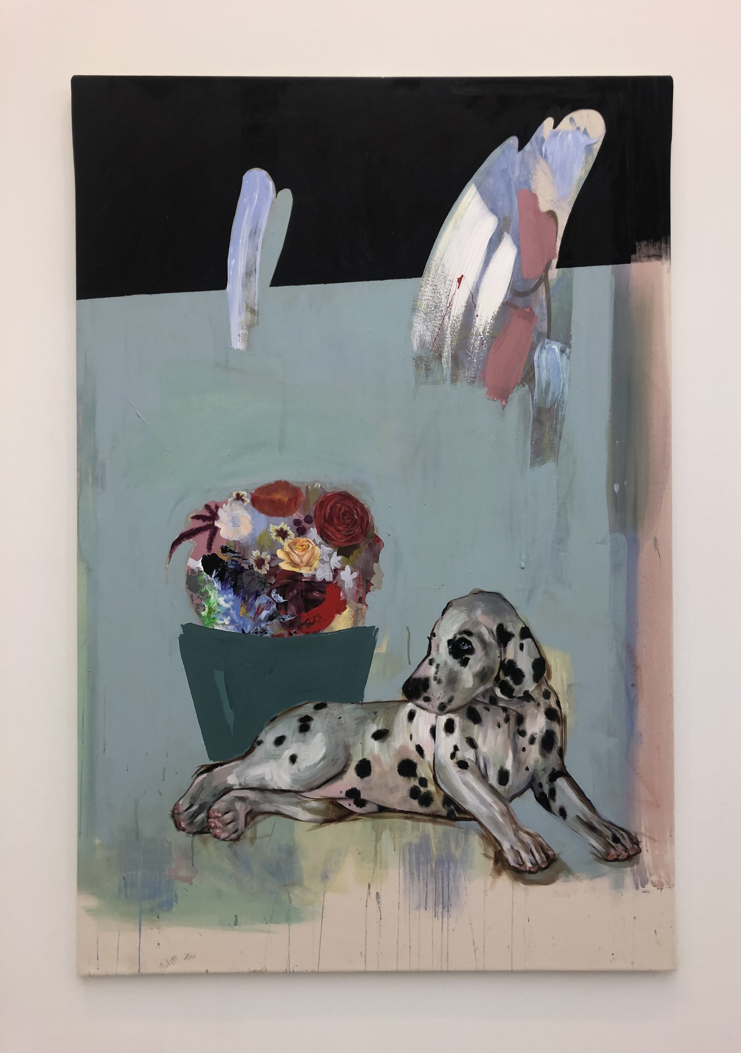 A charming work featuring man’s best friend. Ally McIntyre is a Canadian-born artist who is based in London. Her practice explores various painting techniques, notably with spray paint and acrylic. Her artworks, like the one above explores subjects like the relationships between animals and humans and the natural world.